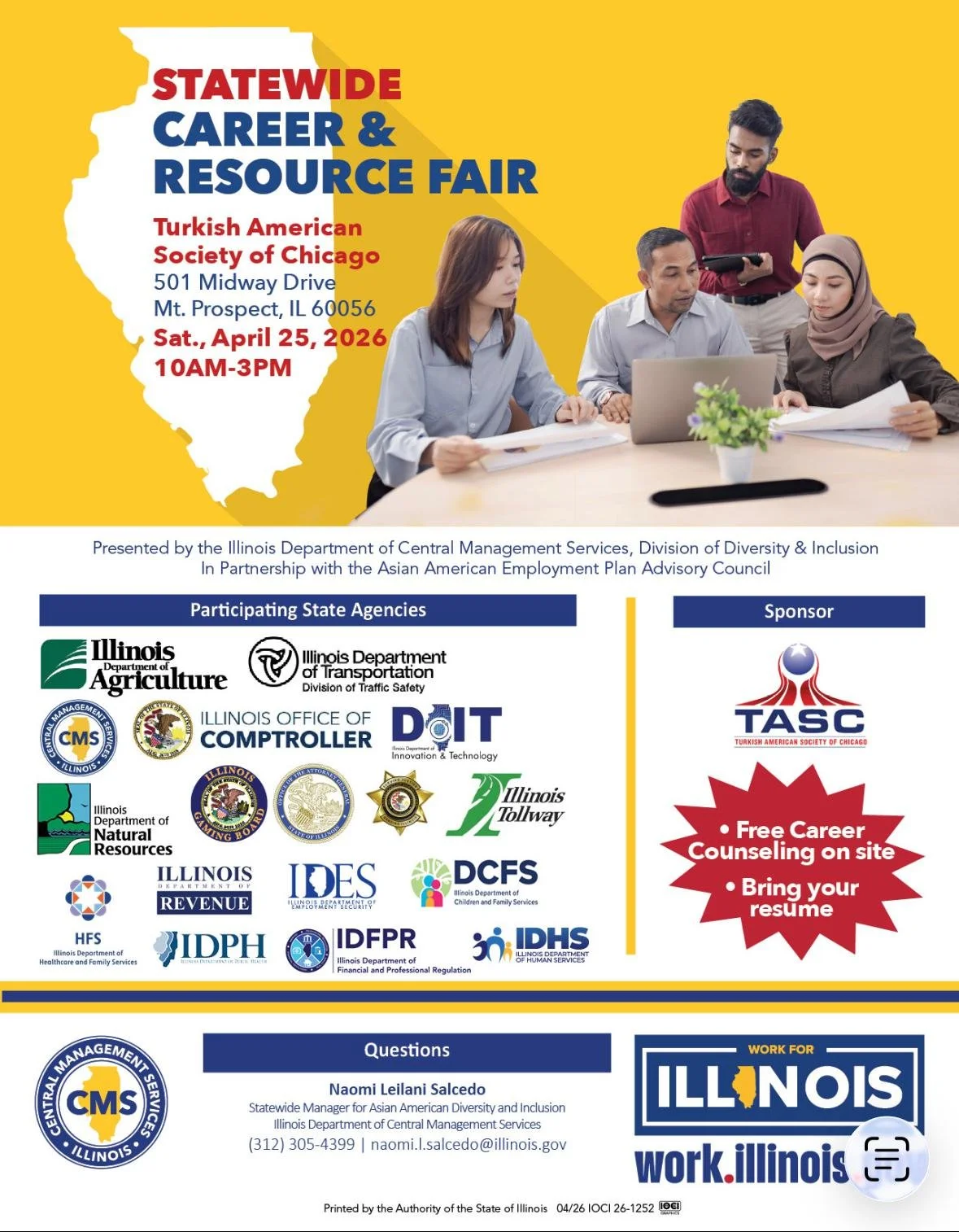 The Turkish American Society of Chicago (TASC) is proud to host the Statewide Career & Resource Fair in collaboration with the Illinois Department of Central Management Services (CMS) – Bureau of Diversity and Inclusion.