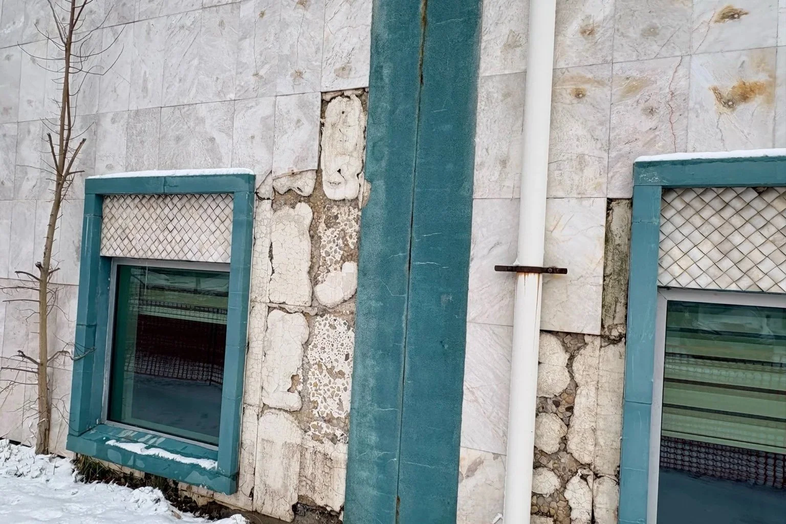However, the marble panels on the south side of our building have started to detach from the wall due to water infiltration that freezes during the winter months. This situation now poses a serious safety risk for pedestrians passing by.